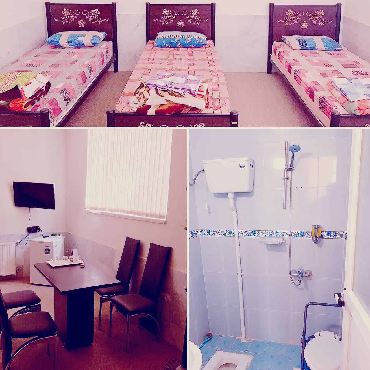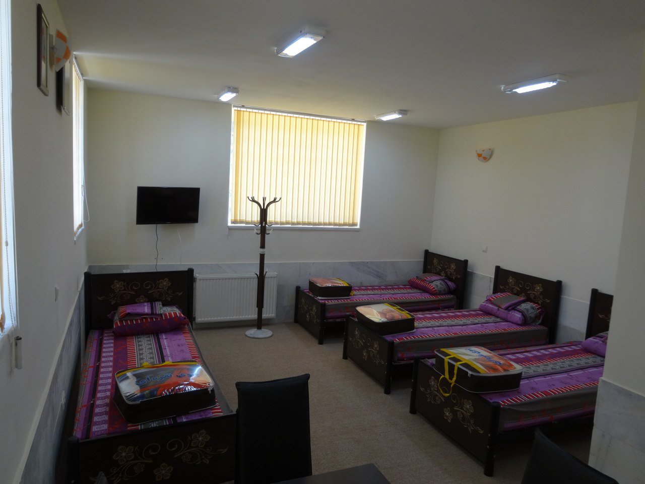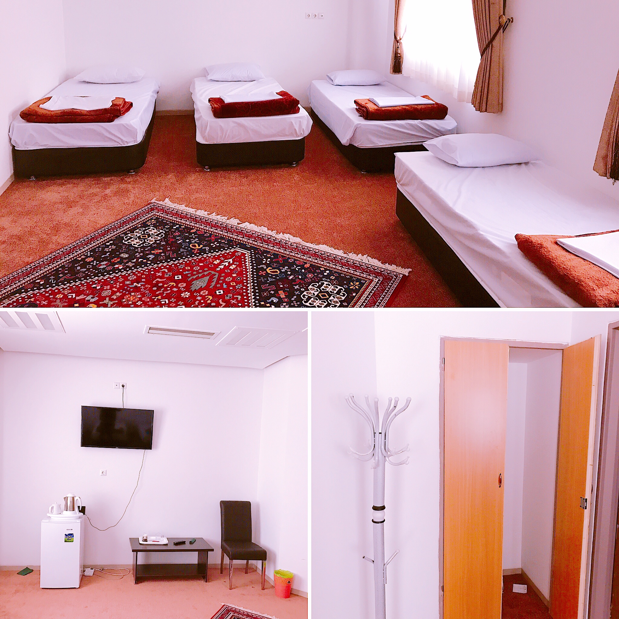 اتاق شامل امکانات:تخت،یخچال،تلویزیون،سرویس حمام ودستشویی(به صورت عمومی)