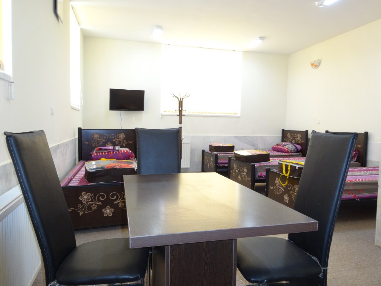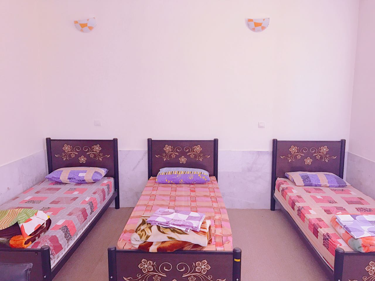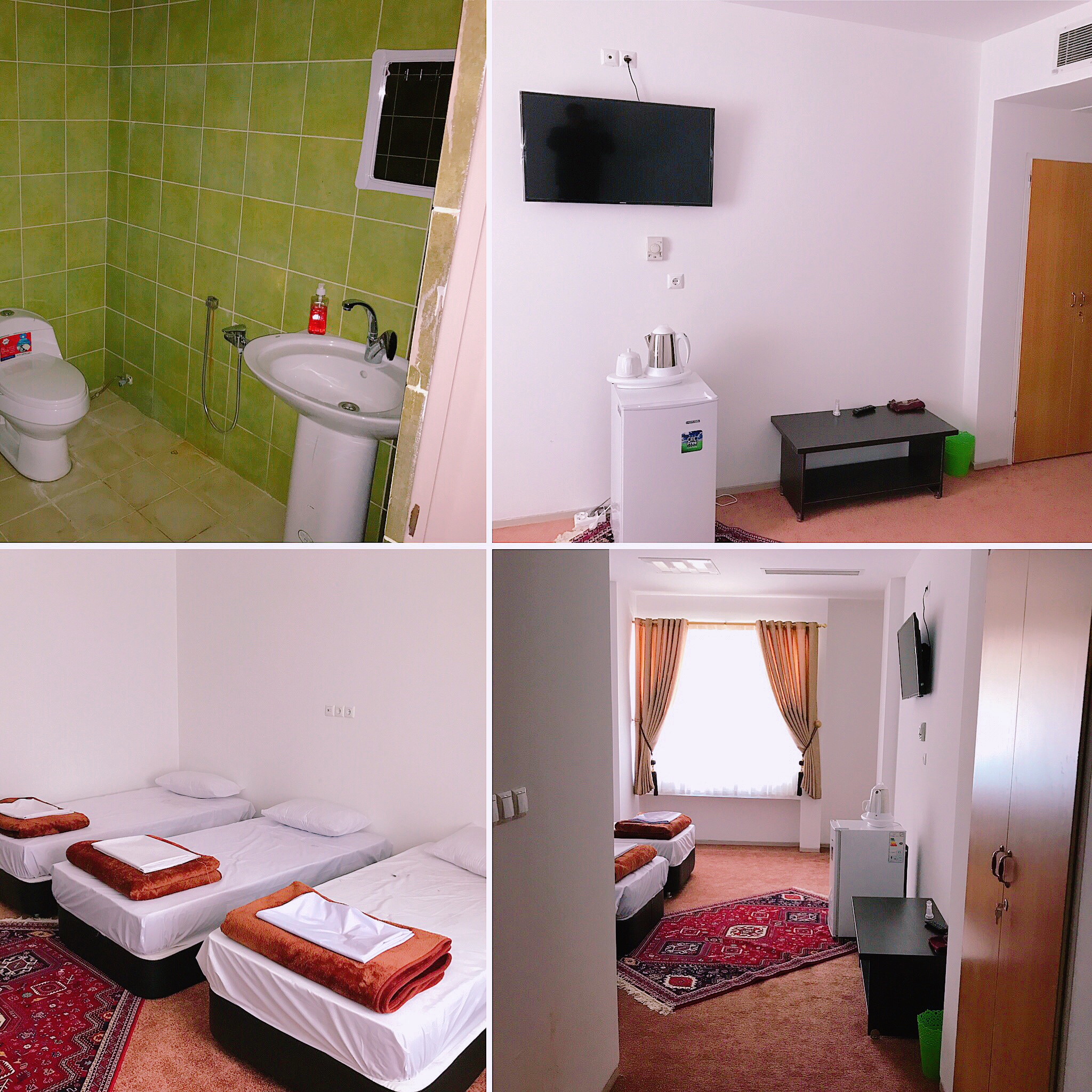 اتاق شامل امکانات:تخت،یخچال،تلویزیون،سرویس حمام ودستشویی(به صورت عمومی)