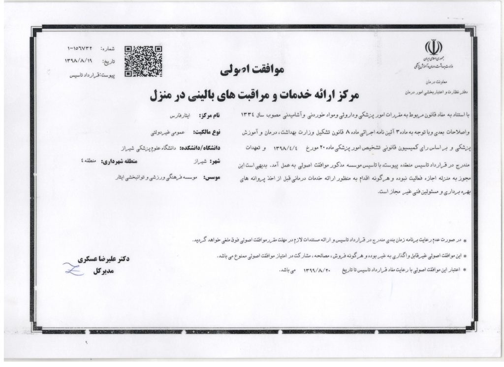 اخذ موافقت اصولی مرکز ارائه خدمات و مراقبت های بالینی در منزل با اولویت ایثارگران و خانواده محترم آنها توسط موسسه فرهنگی ورزشی و توانبخشی ایثار فارس